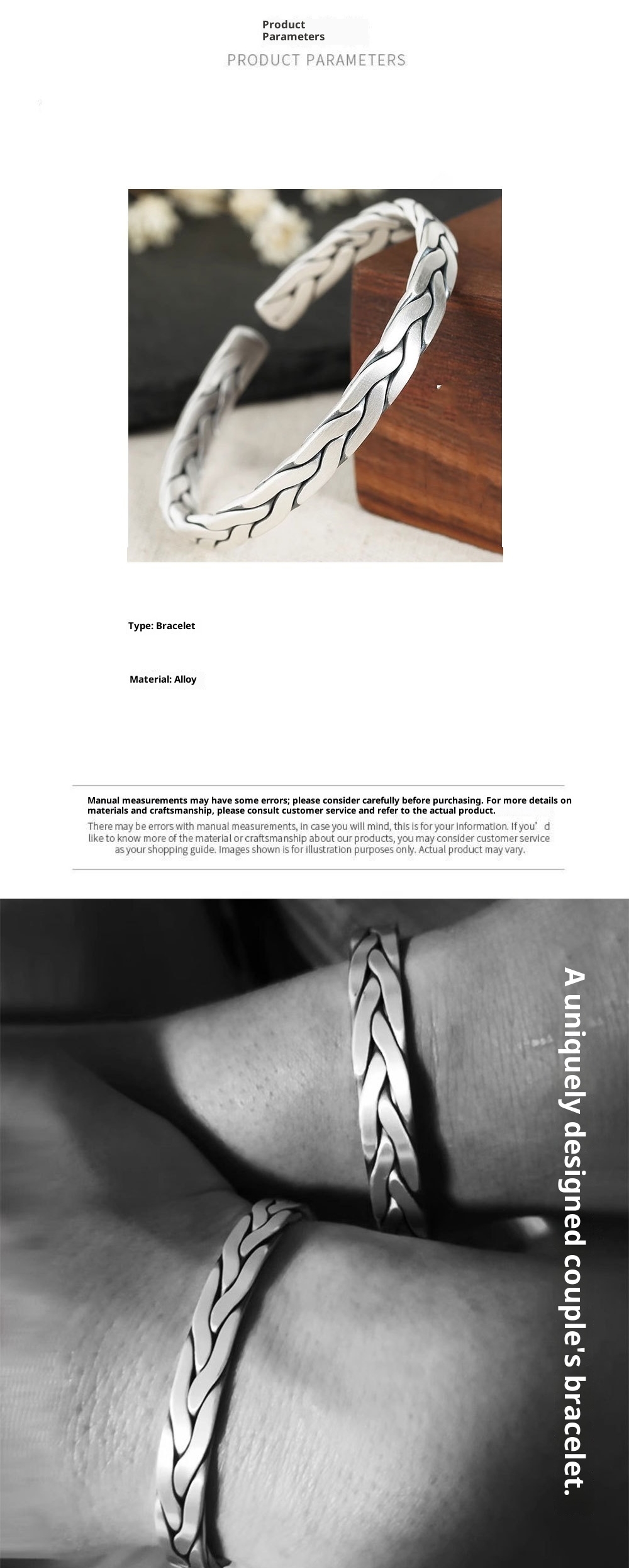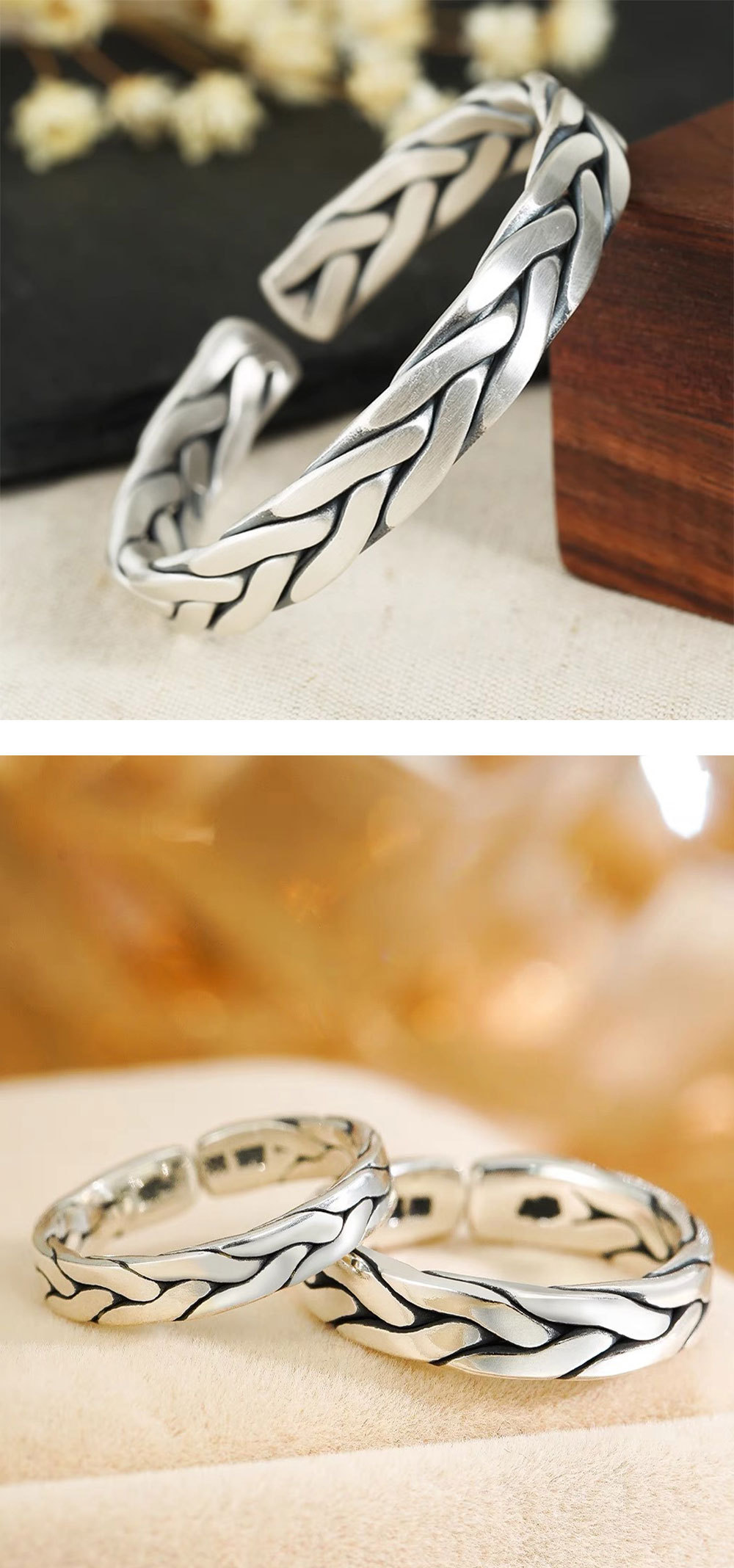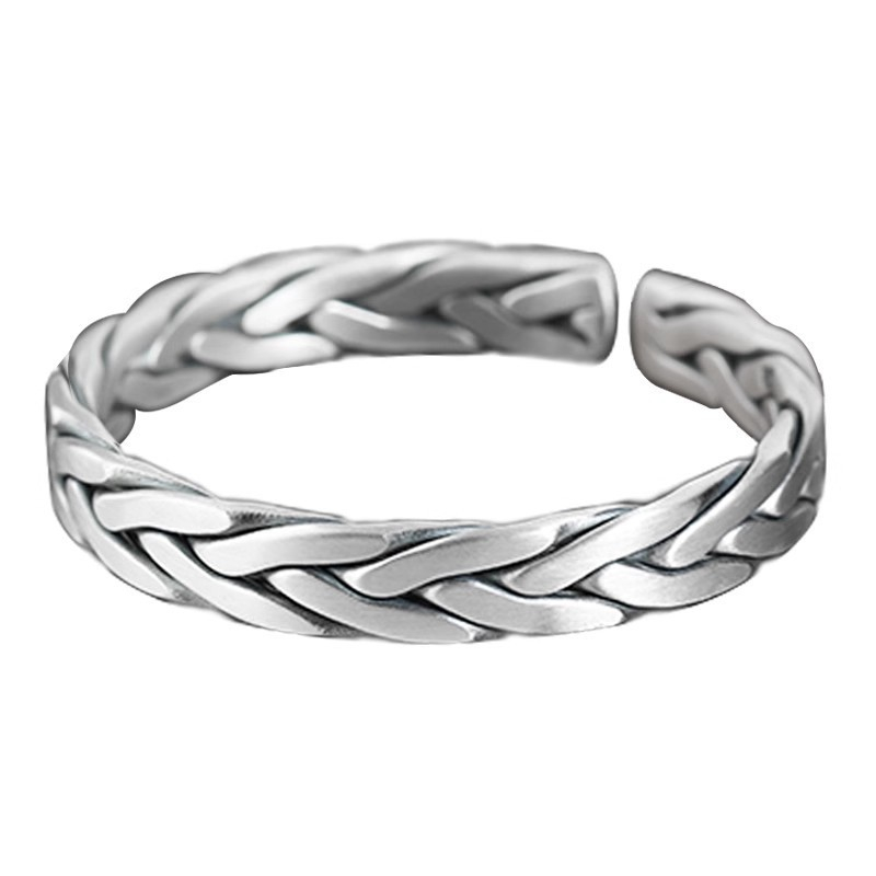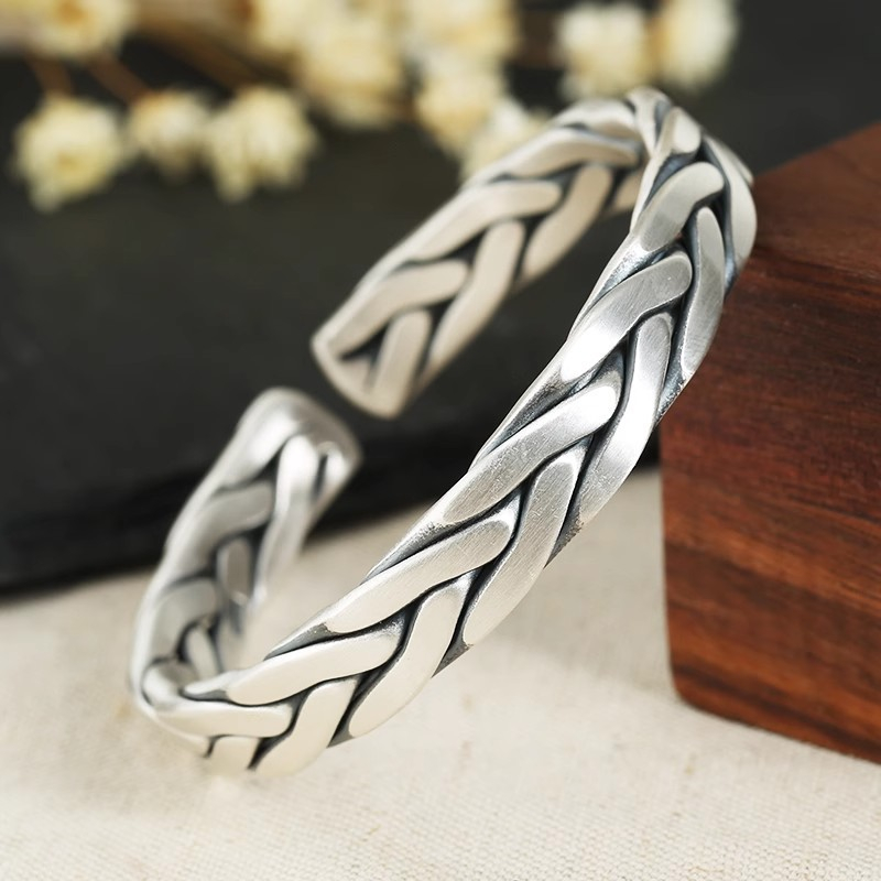 White Copper Plated Thick Silver Weave Vintage Opening Couple Bracelet